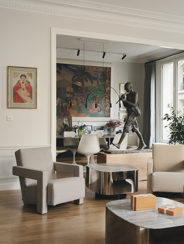 L'utilisation des tons neutres, clairs et harmonieux pour les espaces de partage et de vie commune vient valoriser les oeuvres de notre cliente ; Des coloris plus dynamiques soulignant la simplicité et l’élégance des détails sur mesure sont employés pour les lieux plus intimes.